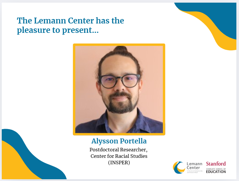 Bio: Alysson Portella, Ph.D. is a Postdoctoral Researcher at the Center for Racial Studies at Insper. His research interests include Economics of Education, Labor Economics, Inequality and Racial Discrimination. In his latest book "Numeros da Discriminacao Racial: Desenvolvimento Humano, Equidade e Politicas Publicas", alongside Michael Franca, they bring analyses on the articulations of racial discrimination in Brazil from the perspective of the economy. The research presents formulations and provocations based on data and empirical analyses, which point to the origin and manifestation of racial discrimination in Brazil based on indices such as income, labor market, education, health, economic development and political representation. In addition, they emphasize the urgency of new possibilities for public policies to create a more just and equitable society.